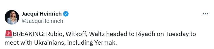 С американской стороны во встрече примут участие советник президента по нацбезопасности Майкл Уолтц, глава Госдепа Марко Рубио и спецпредставитель Трампа Стив Уиткофф. Украинскую делегацию возглавит глава ОП Андрей Ермак.