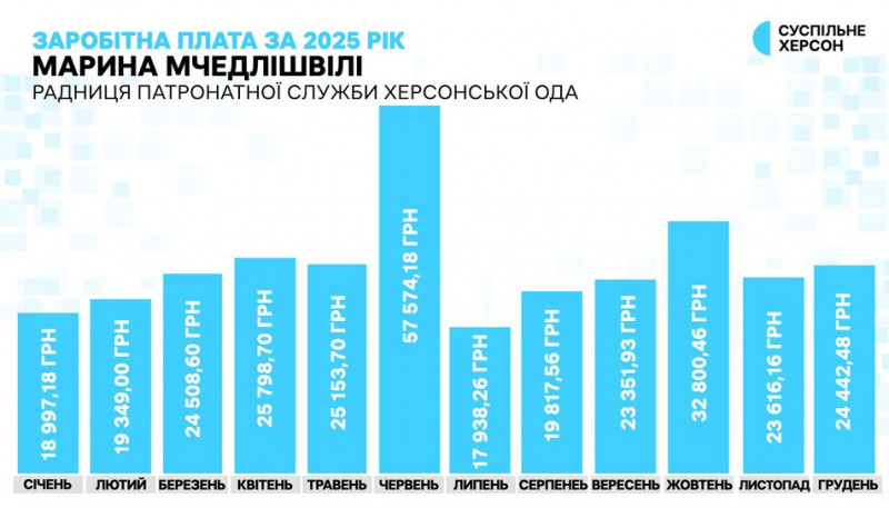 Заробітна плата радниці патронатної служби Херсонської ОДА Марини Мчедлішвілі за 2025 рік помісячно. Інфографіка Суспільне Херсон