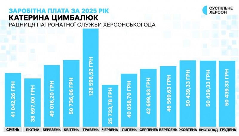 Заробітна плата радниці патронатної служби Херсонської ОДА Катерини Цимбалюк за 2025 рік помісячно. Інфографіка Суспільне Херсон