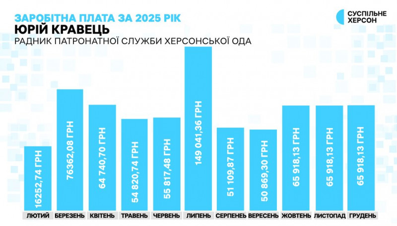 Заробітна плата радника патронатної служби Херсонської ОДА Юрія Кравця за 2025 рік помісячно. Інфографіка Суспільне Херсон