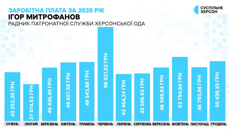 Заробітна плата радника патронатної служби Херсонської ОДА Ігоря Митрофанова за 2025 рік помісячно. Інфографіка Суспільне Херсон