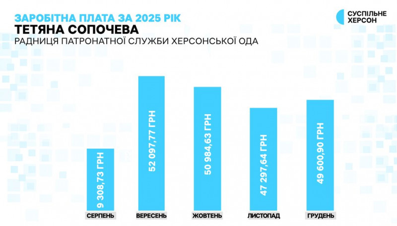 Заробітна плата радниці патронатної служби Херсонської ОДА Тетяни Сопочевої за 2025 рік помісячно. Інфографіка Суспільне Херсон