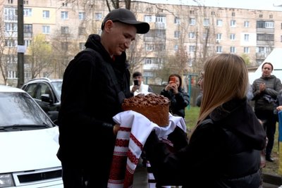 Сусідка Валентина Олійник зустріла Василя Крамара з короваєм.
