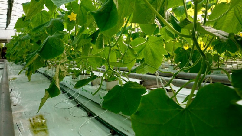 Один момент, який ми не можемо врегулювати в теплиці, — це сонце. Якщо є сонце — у нас тоді щедрий, гарний урожай. Нічна температура повинна бути 18-19 градусів тепла, денна при сонячному дні +25, при похмурому — 21-22 градуси. Це все регулюється вентиляцією, опаленням, яке йде по теплиці. Огірок, як ми всі знаємо, на 90% складається з води, і поливи — це дуже важливо. Якість води і контроль за цим".