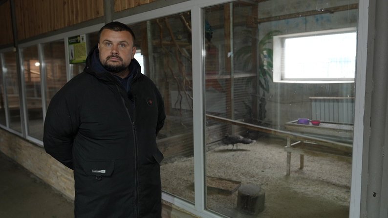 Директор екопарку “Ковалівка” Андрій Тиванюк біля вольєру з птахами турако. Суспільне Полтава