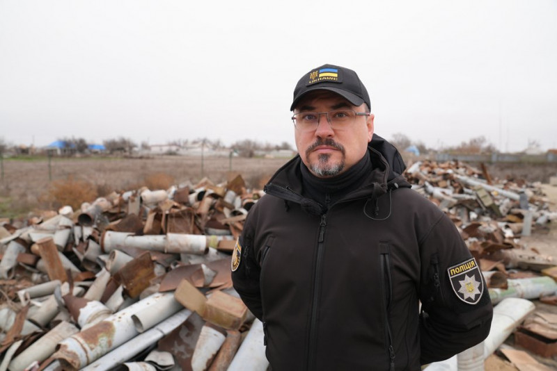 Начальник відділу комунікації ГУ НП в Херсонській області Андрій Кований і снаряди, знайдені на правобережжі. Суспільне Херсон