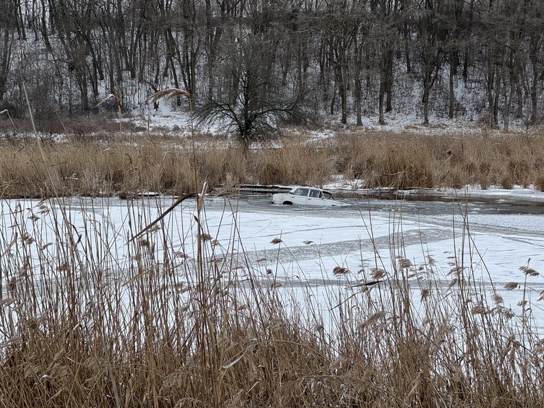 Транспортний засіб частково пішов під воду. Лобове скло в автомобілі пошкоджене, людей у ньому та біля нього видно не було. Натомість поблизу цього місця на кризі водойми велика кількість слідів від автомобільних шин. Це може свідчити про те, що водій їздив по кризі на транспорті.