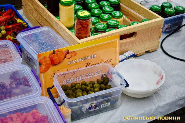 Найбільше цікавого на виставку та дегустацію привезла колекціонерка Наталія Боярчук. На столі – різні сорти квасолі, гострого перцю, гарбузів, хліб, борошно, соки, олія, цукерки і багато інших позицій, приготовлених із гарбуза.