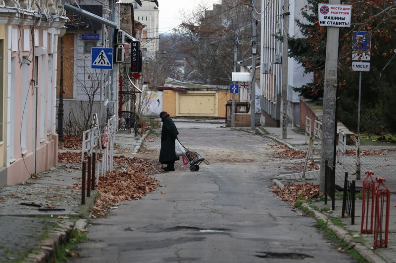 Жінка з візком йде вулицею у середмісті Херсона, грудень 2025 року. Суспільне Херсон/Олександр Корняков