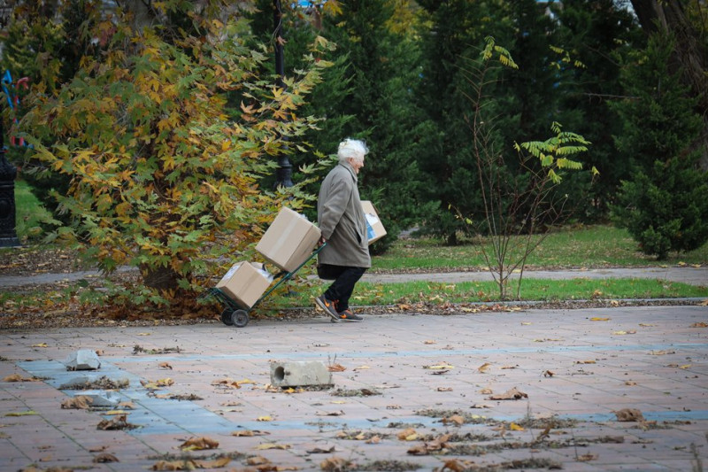 Пенсіонерка йде з коробками гуманітарної допомоги, Херсон, листопад 2025 року. Суспільне Херсон/Олександр Корняков