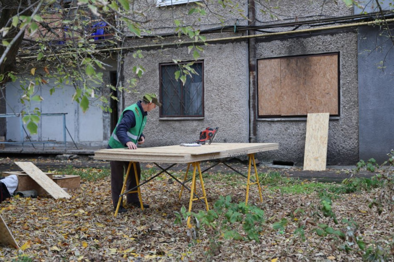 Комунальник вирізає фанеру, щоб забити пошкоджені внаслідок ударів РФ вікна, Херсон, 20 жовтня 2025 року. Суспільне Херсон/Олександр Корняков
