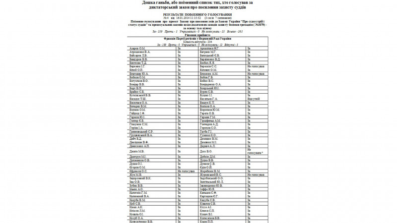 Поіменний список тих, хто голосував за диктаторські закони 16 січня 2014 року Українська правда