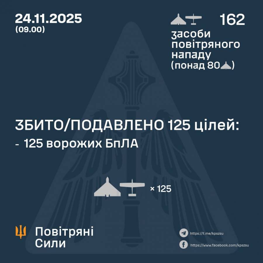 По данным ВС ВСУ, армия РФ применила дроны Shahed, “Гербера” и других типов – всего более 162 единиц, из которых более 80 “Шахеды”. Авиция, ЗРК, подразделения РЭБ и мобильные огневые группы украинских войск отразили большую часть атак. На утро 24 ноября сбито или подавлено 125 вражеских дронов. Тем не менее зафиксировано попадание 37 ударных БПЛА на 15 локациях и падение обломков на одной.