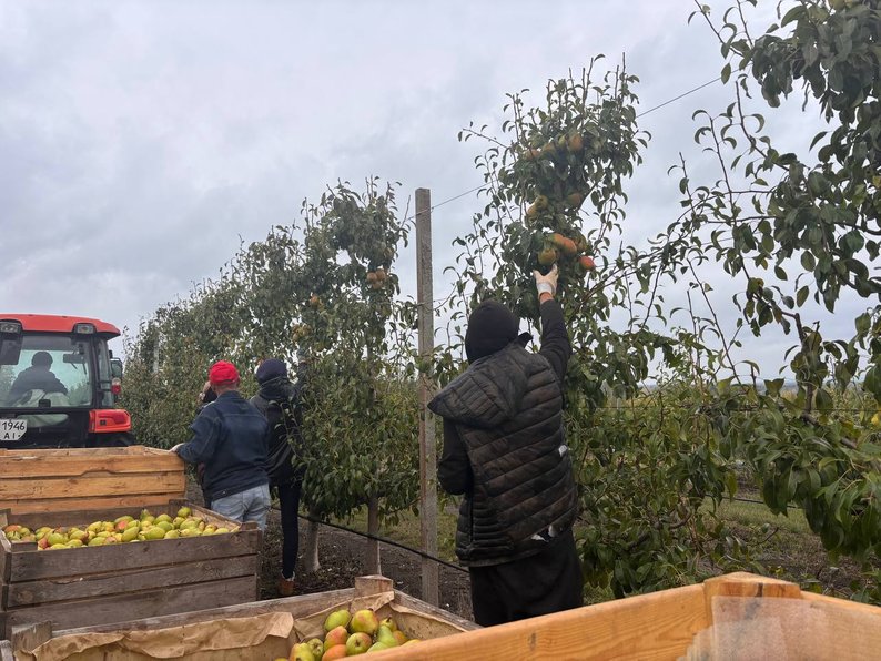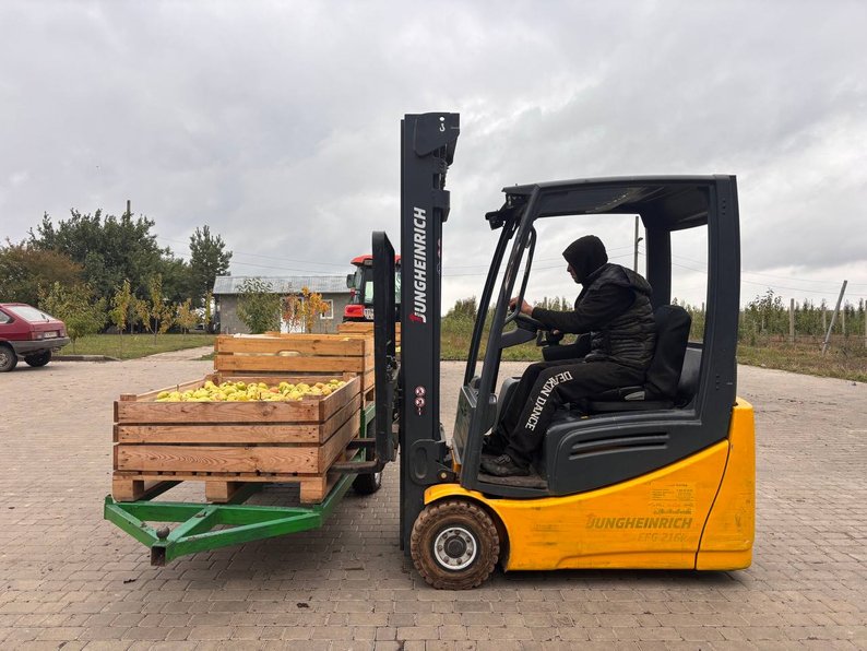 "Робимо все дуже обережно, у рукавицях. Кладемо їх, не кидаємо, бо це дуже лагідний сорт. Платформа чіпляється до трактора, четверо людей стають і зривають, роблять так, щоб було доступно, щоб усе можна було дістати, бо якщо просто тягнутися, вона обривається, падає і псується".
