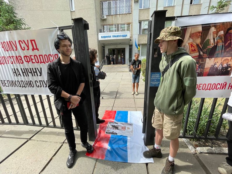 На вході до Будинку правосуддя митрополита зустрічали з плакатом із зображенням Путіна та московського патріарха Кіріла. Суспільне Черкаси