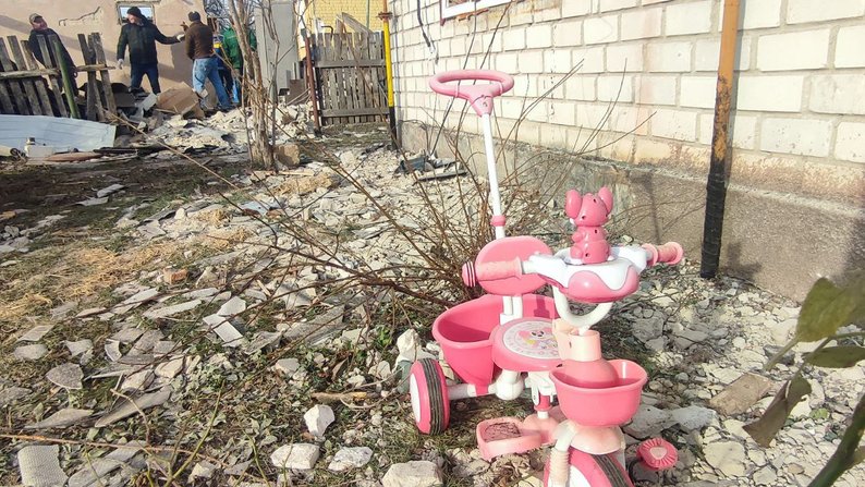 Дитячий триколісний велосипед у подвірʼї зруйнованого будинку у Смілі. Фото: Суспільне Черкаси / Оксана Швед