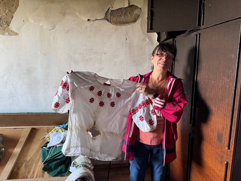 Пані Валентина показує вишиванку, пошкоджену внаслідок атаки. Суспільне Черкаси/Дарія Шевченко
