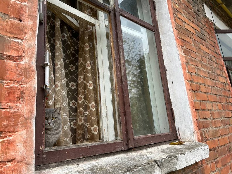 Кіт визирає у вибите вибуховою хвилею вікно. Суспільне Черкаси/Віта Кавун