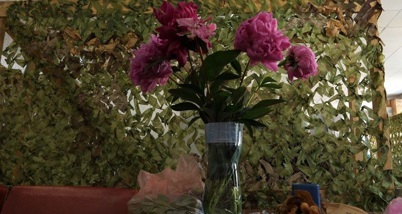 Букет на фоні маскувальної сітки у волонтерському центрі. Суспільне Черкаси