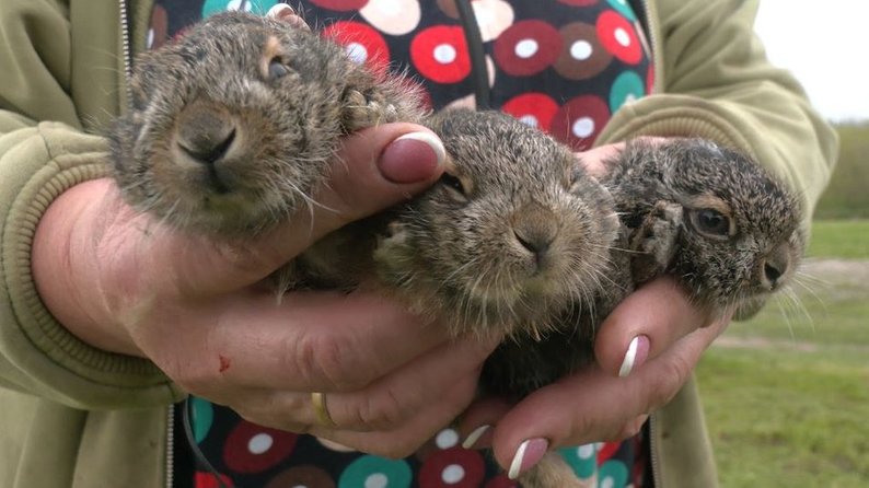 Чотирьох зайченят знайшов житель села Чубівка прямісінько на своєму подвір’ї, коли косив траву. Спочатку чоловік тваринок забрав додому, аби вигодовувати. Опісля — вирішив повернути знову до природи. Фото: Суспільне Черкаси