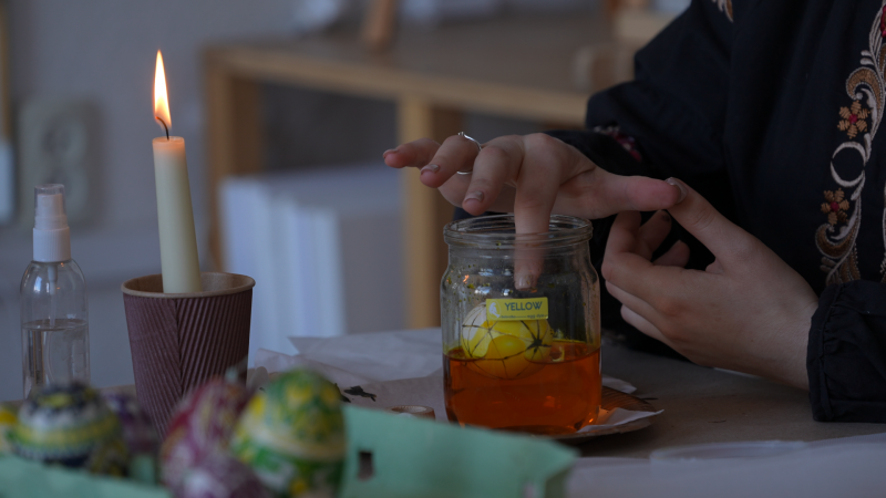 Майстриня занурює яйце в аніліновий барвник. Суспільне Полтава