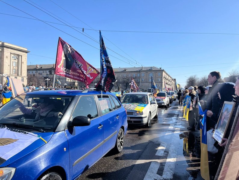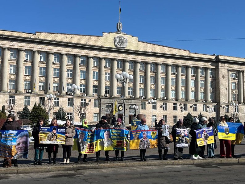 На Соборній площі з прапорами й плакатами зібралися близько сотні людей — рідні, друзі захисників, волонтери, військові та небайдужі містяни. Водіїв, які проїжджали повз, закликали посигналити та підтримати родини воїнів.