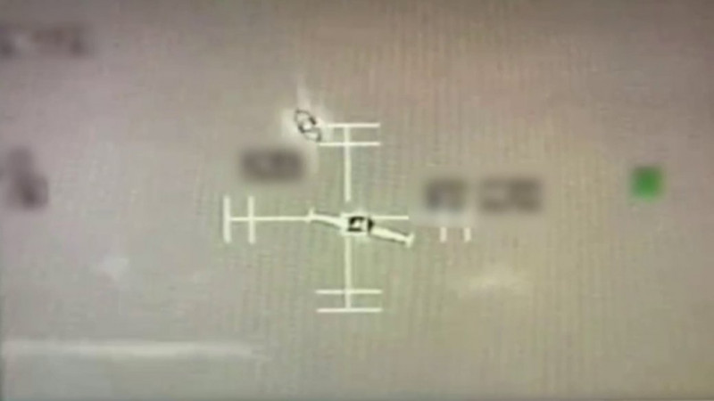 Момент зіткнення дрона-перехоплювача з російським “шахедом” 14 січня 2026 року. Повітряні сили ЗСУ