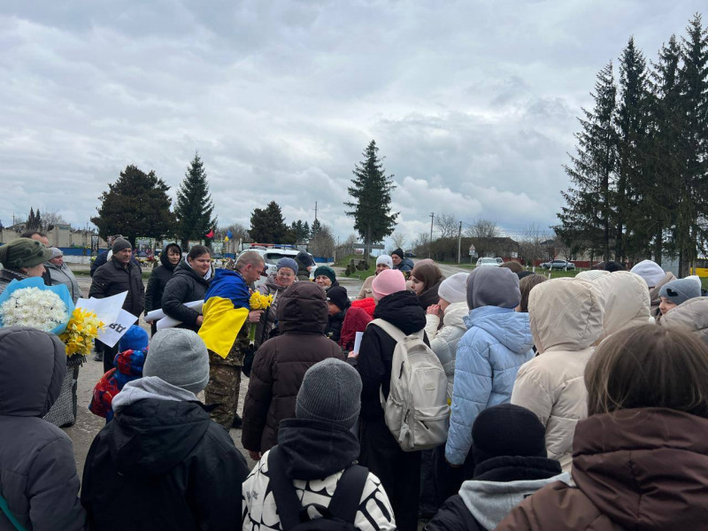 Як йдеться в дописі, Володимир Кушнір був у російському полоні два роки. Зустріли захисника жителі громади, серед них і учні місцевої школи, які вітали військового квітами і плакатами.