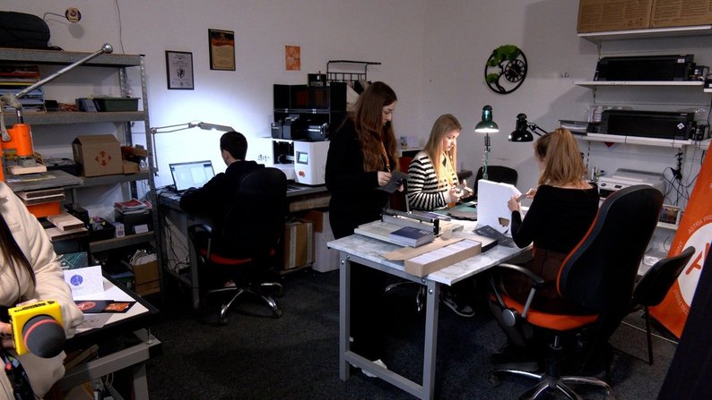 Наразі у неї працюють четверо людей. Серед них — Максим, який займається тисненням пластикових карток на спеціальному обладнанні. Розповів, що робота для нього не лише цікава, а й корисна, адже він — студент третього курсу спеціальності "Журналістика". Тож тут здобуває практичний досвід.