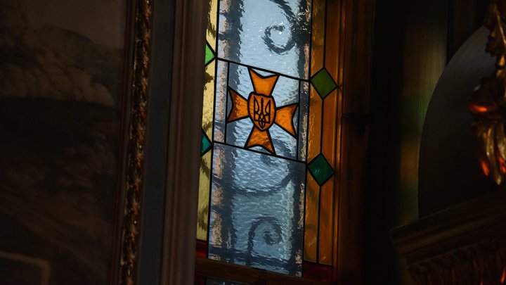Ви можете побачити, що вікна нашого храму прикрашені вітражами, на яких зображені хрести. Такі хрести зустрічалися в християнській церкві, особливо, в козацьку добу. Тому цей елемент є якраз про козацтво.