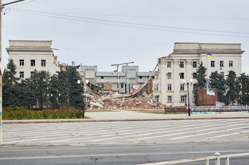 Будівля обласної військової адміністрації у Херсоні, яку зруйнували російські обстріли, жовтень 2025 року. Суспільне Херсон