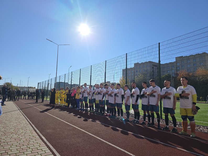 Шикування перед футбольним матчем за участі ФК “Юнайтед”, у складі якого грав полеглий захисник Віталій Драченко, та Національної збірної ветеранів України. Суспільне Вінниця