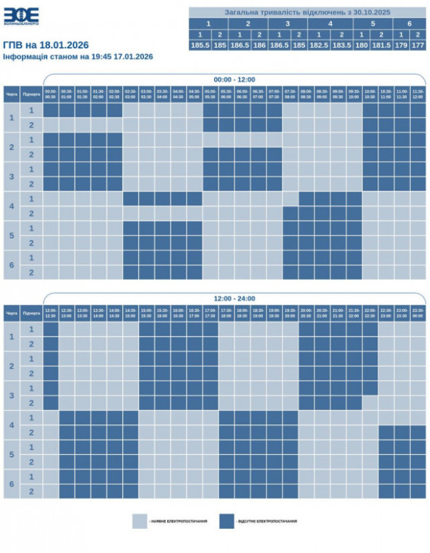 Час вимкнення та відновлення електропостачання може відрізнятись від заявленого у графіку на 20-30 хвилин. Таке відхилення пов’язане із технологічним процесом перемикання черг службами «Волиньобленерго».