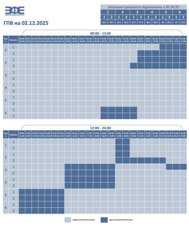 Час відключення та відновлення електропостачання може відрізнятись від заявленого у графіку на 20-30 хвилин. Таке відхилення пов’язане із технологічним процесом перемикання черг службами «Волиньобленерго».