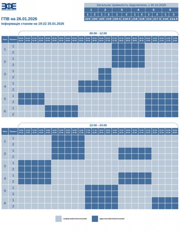 Час вимкнення та відновлення електропостачання може відрізнятись від заявленого у графіку на 20-30 хвилин. Таке відхилення пов’язане із технологічним процесом перемикання черг службами «Волиньобленерго».