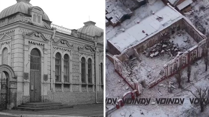 Будівля, у якій був краєзнавчий музей в Гуляйполі, на початку ХХ століття та в грудні 2025. Facebook/ Гуляйпільські старожитності | Instagram/ nasheguliaipole