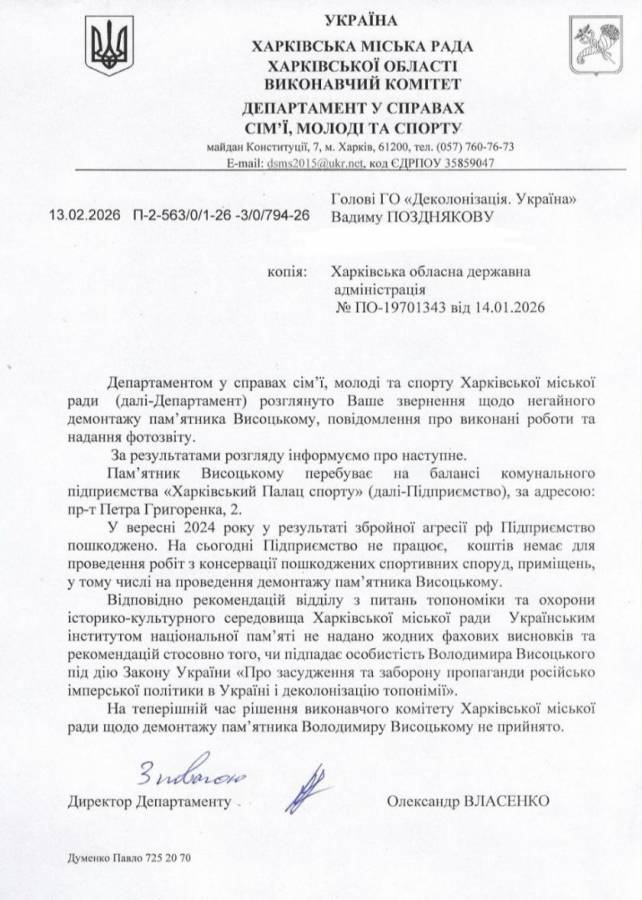 “Харківська міська рада досі не ухвалила рішення про демонтаж пам’ятника російському співаку Владіміру Висоцькому біля розбитого російськими ракетами Палацу Спорту. Звертаємося з вимогою нарешті ухвалити це рішення та провести демонтаж. У 2026 році дико мати такий об’єкт. Це один з останніх найбільших російських пам’ятників у місті. І на часі нарешті його прибрати”, йдеться у заяві активістів.