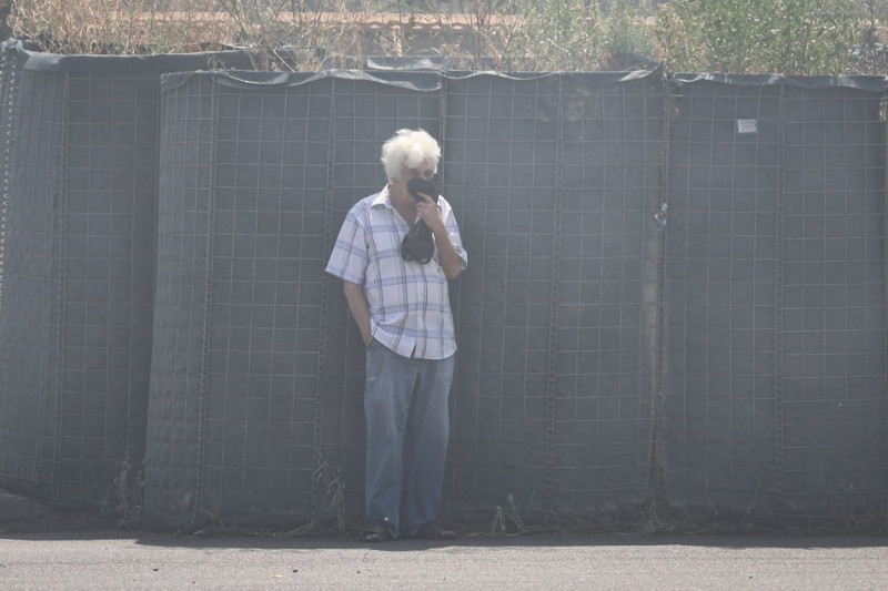 Через щоденні обстріли й спричинені ними пожежі у Херсоні часто виникає смог. В такі дні вулицями можна було пересуватись тільки прикривши обличчя. На фото — житель Херсона біля габіонів, 20 червня 2025 року. Суспільне Херсон/Олександр Корняков