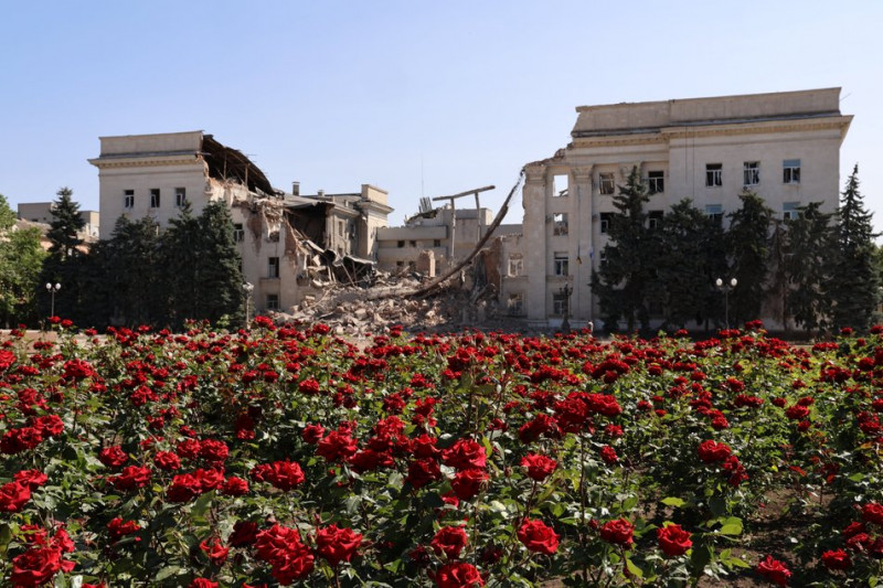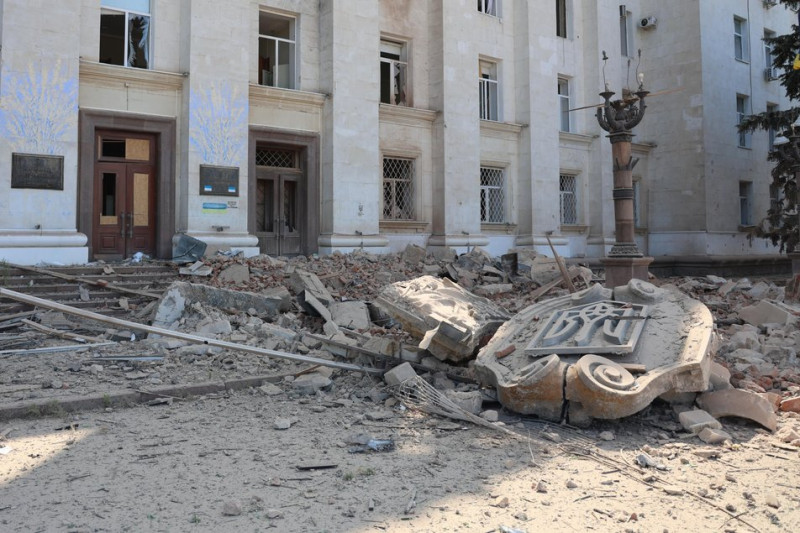 5 червня російські окупанти вирішили знищити будівлю Херсонської ОДА. Двічі атакували авіабомбами. Першим ударом частково зруйнували будівлю адміністрації та підʼїзд сусідньої багатоповерхівки, пошкодили навколишні будинки та три навчальні заклади. Поранення отримали троє людей. Суспільне Херсон/Олександр Корняков