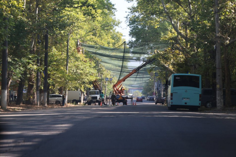 У серпні на семи ділянках правобережжя Херсонщини, зокрема й у Херсоні, через посилення атак російських дронів почали встановлюють антидронові сітки. Ними облаштовували логістичні шляхи, у тому числі й трасу М-14 Херсон — Миколаїв та вулиці обласного центру. На фото — Херсон, 28 серпня 2025 року. Суспільне Херсон/Олександр Корняков