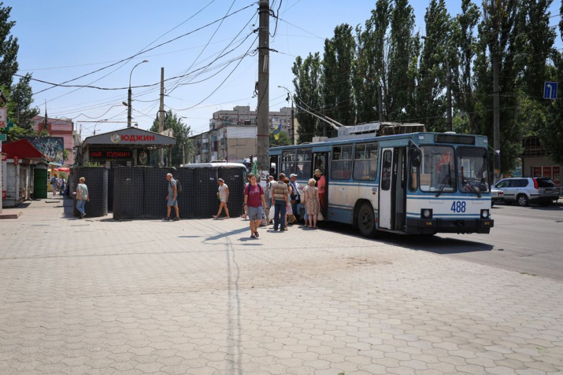 Громадський транспорт на вулицях прифронтового міста. Він — один з об’єктів, на який полювали російські дрони у Херсоні. Часто його роботу призупиняли через пошкодження внаслідок обстрілів контактних мереж, після ремонтів знову поновлювали. Так вигляд мала зупинка у Корабельному районі Херсона, 5 липня 2025 року. Суспільне Херсон/Олександр Корняков