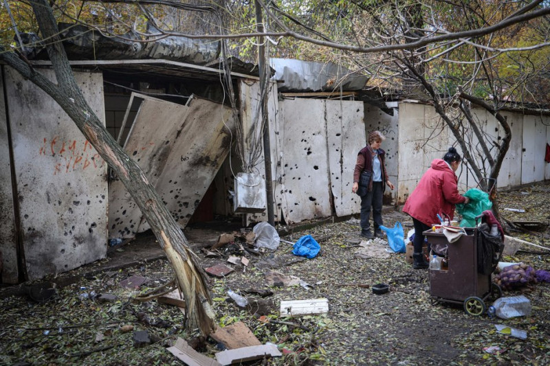 31 жовтня російські військові обстріляли Дніпровський район Херсона з артилерії. Під вогонь потрапили багатоповерхівки та міський ринок. Двоє людей загинули, 12 – отримали поранення. На фото – жінки прибирають наслідки обстрілів Дніпровського ринку. Суспільне Херсон/Олександр Корняков
