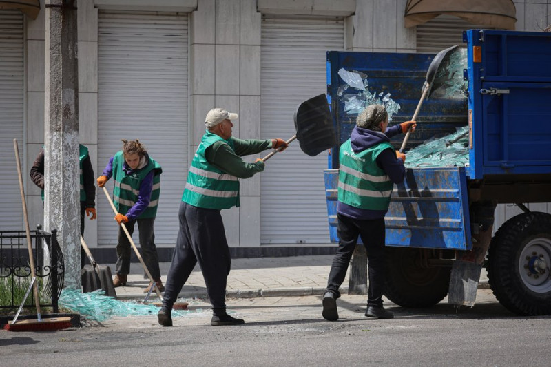 Після російських атак одними з перших на місці з’являються працівники комунального підприємства “Парки Херсона”. Вони забивають пошкоджені вікна, прибирають скло й уламки на вулицях, допомагають місцевим жителям. Часто їм доводиться працювати, коли атаки ще тривають. На фото — середмістя Херсона 13 травня 2025 року. Суспільне Херсон/Олександр Корняков