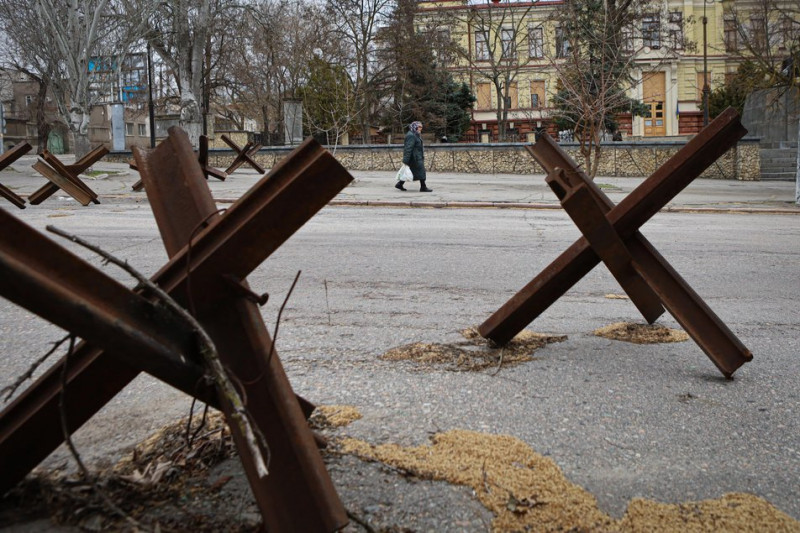 Прибережна зона Херсона — територія, яка найбільше обстрілювалась й обстрілюється зараз військами РФ. На фото — район річпорту 18 березня 2025 року. Біля художнього та краєзнавчого музеїв — протитанкові їжаки. Більшість місцевих жителів з цього району виїхала, залишились в основному літні люди, які не хотіли покидати свої домівки. Суспільне Херсон/Олександр Корняков