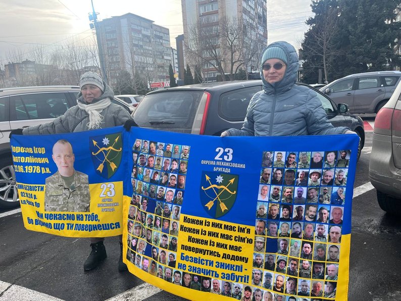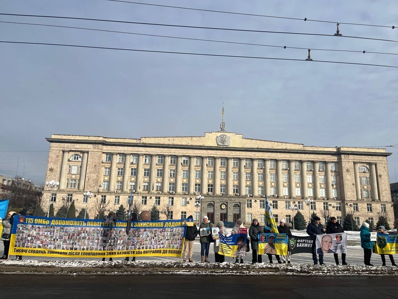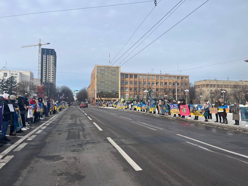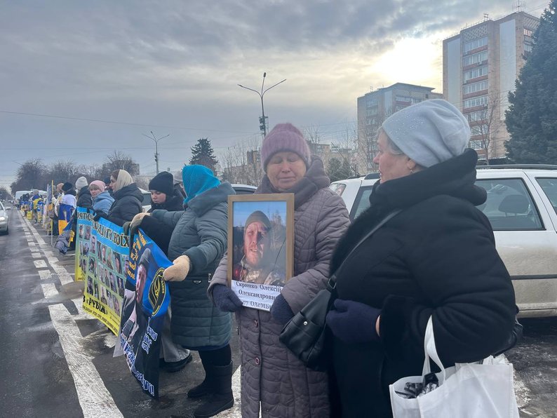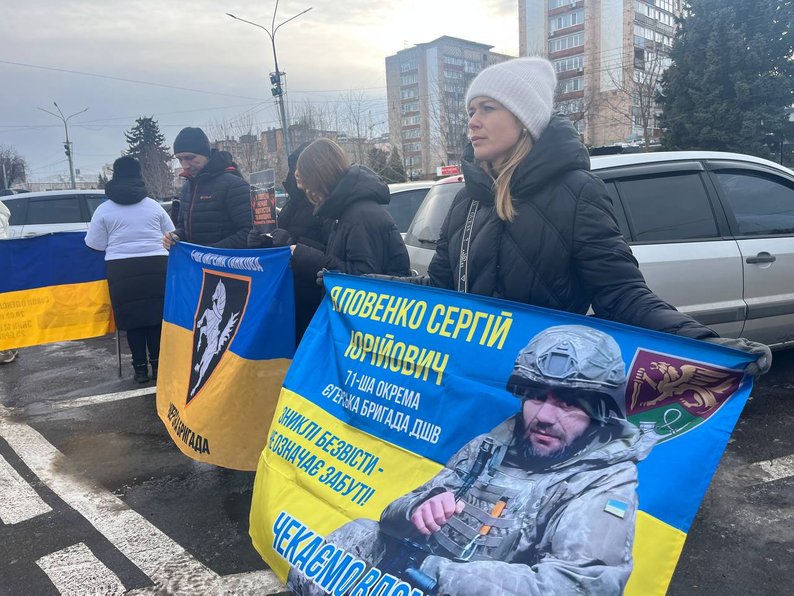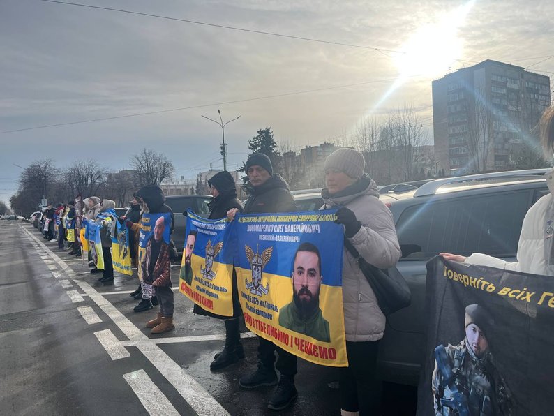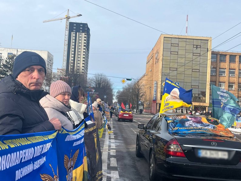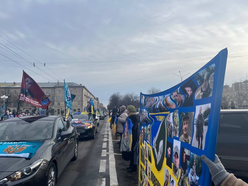 На Соборній площі з прапорами й плакатами зібралися близько сотні людей — рідні, друзі захисників, волонтери, військові та небайдужі містяни. Водіїв, які проїжджали повз, закликали посигналити та підтримати родини воїнів.