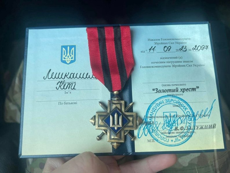 “Золотий Хрест”, який медикині та снайперці присвоїв Головнокомандувач ЗСУ Залужний. Фото надала Кеті Лешкашелі"У 2023 році 24 березня була операція. Ми вийшли на бойове завдання. Нас розстріляли з танка: двоє загинули, двоє важко поранені, я і ще один хлопець залишилися. Наша позиція була за 700 метрів. Він вирішив піти туди, бо поранені стікали кров'ю і їх потрібно було швидко евакуювати. Нас почали "крити", Я відкрила гранату і тримала: а що я сама зроблю, якщо кацапи прийдуть? Я не покинула своїх хлопців і потім прийшла підмога, забрали "трьохсотих", але ми мали лишитися на позиції, щоб її не втратити. Вони пішли, і ми з одним солдатом залишилися, правий фланг самі тримали. Тому, що я дівчина, мабуть, через це мене нагородили", — розповіла Кеті Лешкашелі.