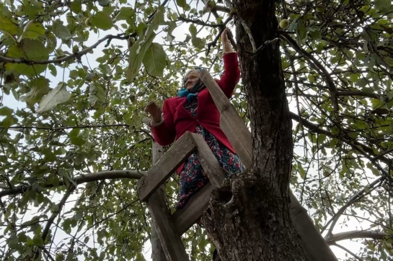 83-річна Ніна Якимчук із Володимирця, що на Рівненщині, заготовляє на зиму яблука та груші — то для неї найкращі смаколики. Намагається запасати їх у коморі цілими та неушкодженими. Для цього з допомогою драбини дістається гілок та зриває плоди, або струшує їх із верхівок.