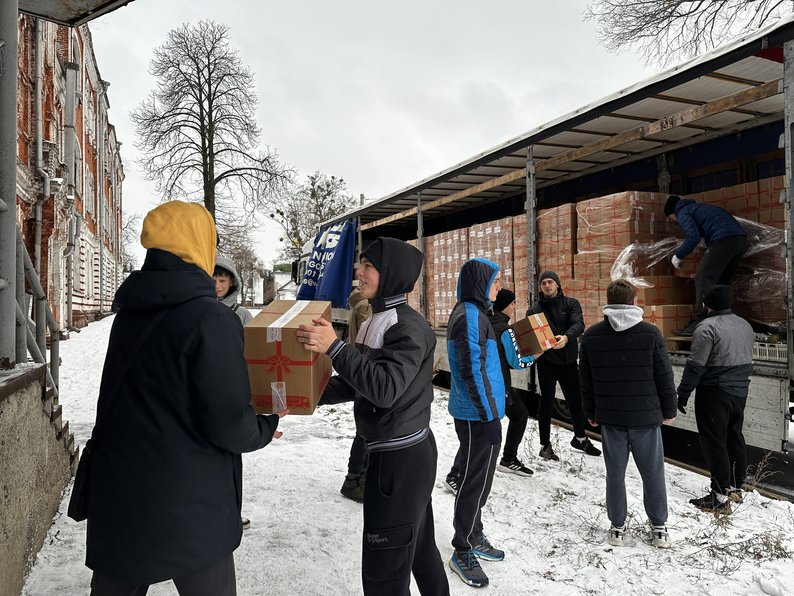 Полтавські спортсмени допомагають розвантажити вантажівку з гуманітарною допомогою. 2024. Суспільне Полтава