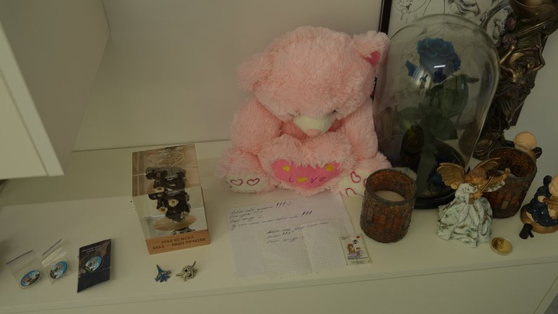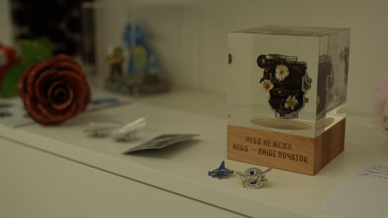 Також речі чоловіка вона зберігає в окремій кімнаті. У ній форма льотчика, його нагороди, фото, записки та подарунки, які дарував дружині. Серед них — інсталяція з уламку літака, яку подарував Альоні друг Дениса.