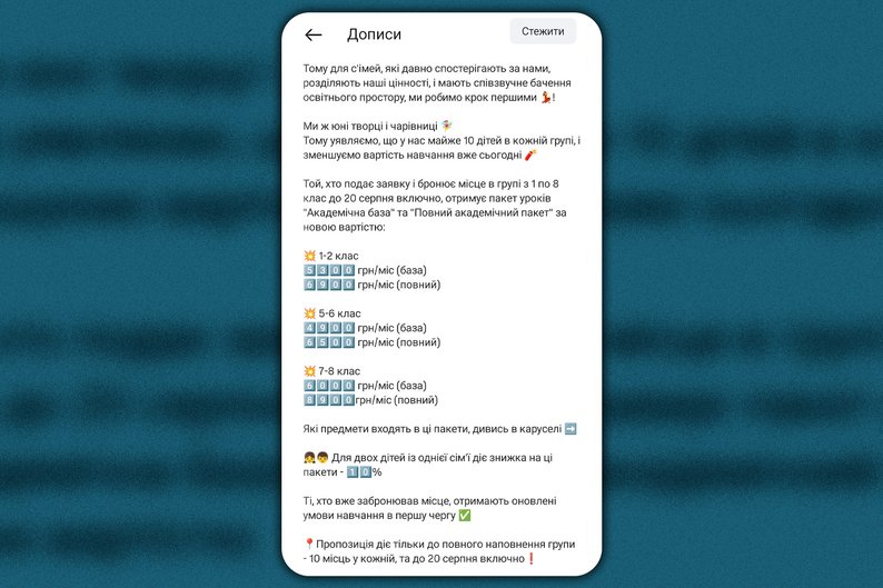 Одразу кілька читачів Суспільного звернулися до редакції зі скаргами на діяльність "Асгарду". На сторінці в інстаграмі "Сімейний освітній простір Асгард", зазначено, що це — альтернативна школа початкової та середньої ланки. Заняття тут — платні. В одному з дописів вказані ціни зі знижками на пакет уроків: 1-2 клас від 5300 до 6900 грн в місяць, 5-6 клас — 4900-6500 грн, 7-8 клас — 6000-8900 грн.